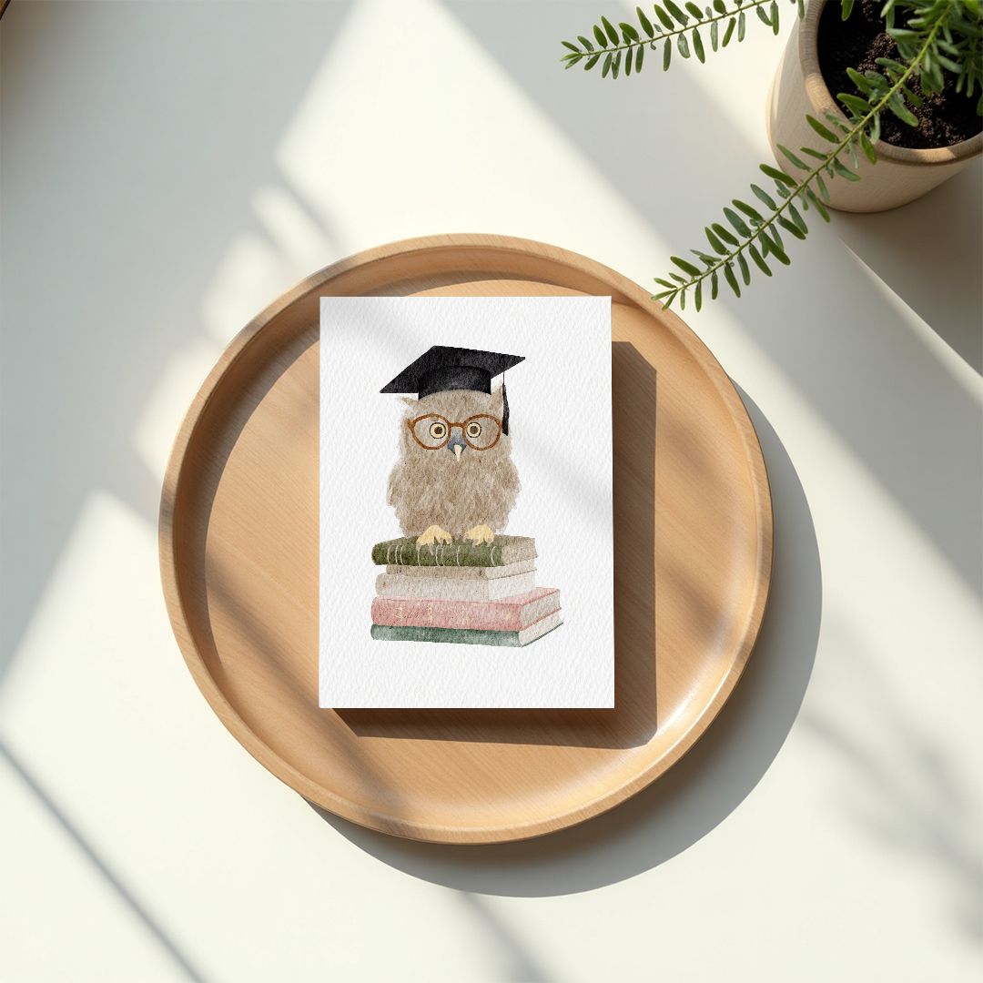 Weise Eule mit Doktorhut und Bücherstapel – diese Karte ist ein humorvoller und zugleich stilvoller Begleiter zu Abschlüssen, Prüfungen oder Examina. Ein motivierender Gruß für alle, die einen Meilenstein geschafft haben.