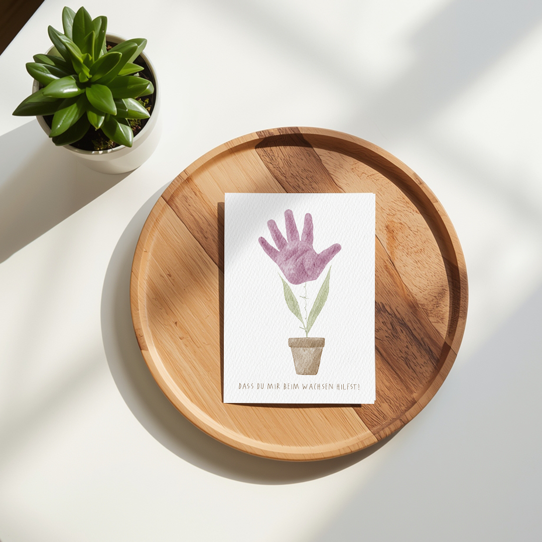 Eine Kinderhand, die wie eine Blume aus dem Blumentopf wächst – diese Karte sagt auf originelle Weise „Danke“. Perfekt als Dankeschön für Erzieher und Erzieherinnen, Lehrer und Lehrerinnen, Omas und Opas oder besondere Menschen im Alltag.