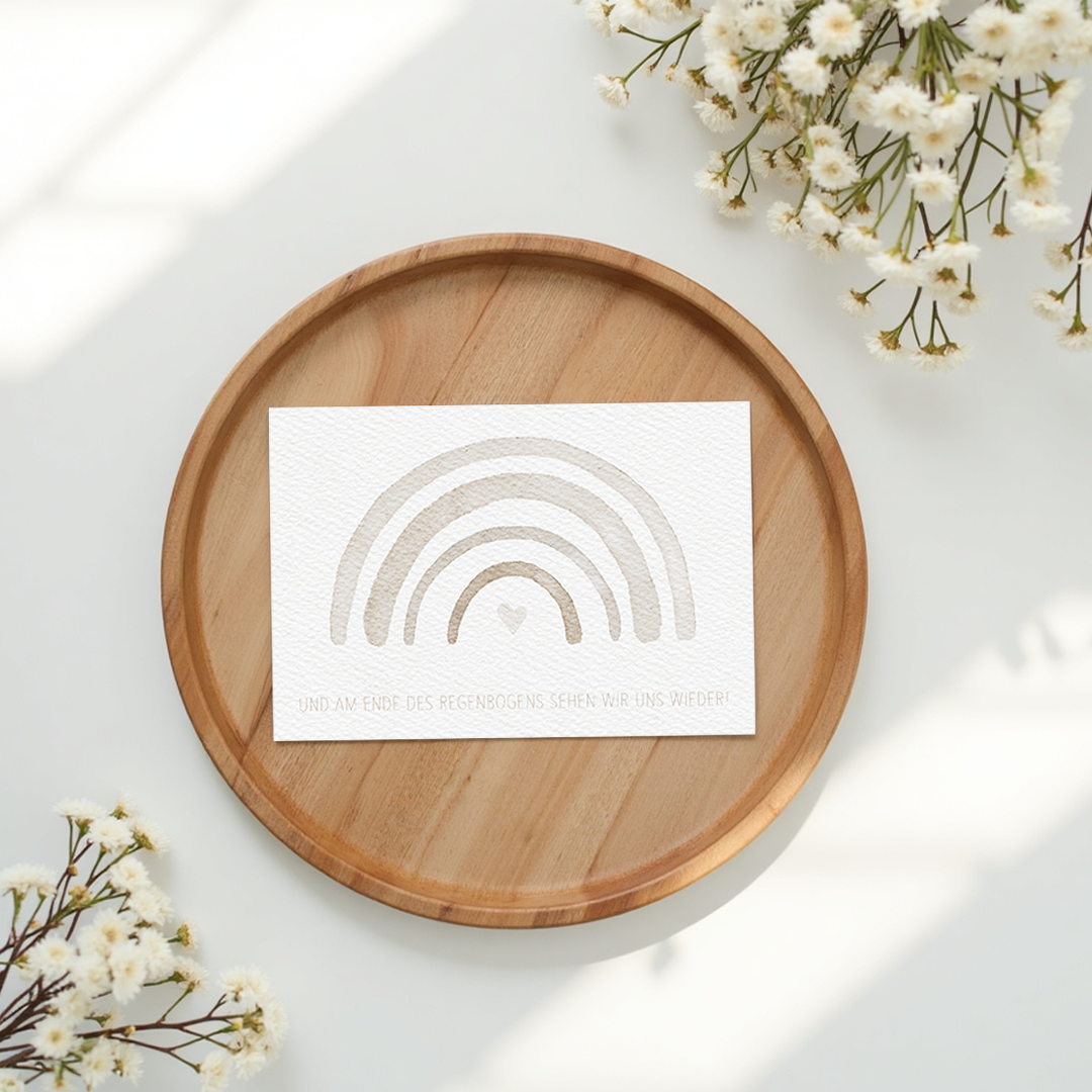 Wenn die Worte fehlen, spricht ein Regenbogen von Hoffnung und Verbundenheit. Diese schlichte Karte bringt Trost und zeigt, dass nach jedem Regen wieder Sonne kommt.