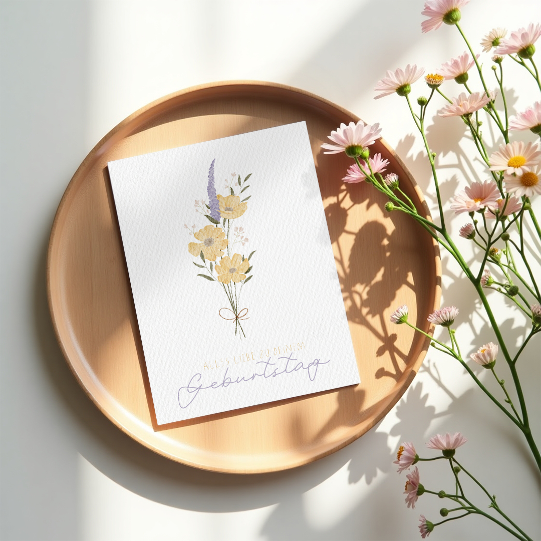 Mit diesem liebevollen Wildblumensträußchen wird jedes Geburtstagsgeschenk zu etwas ganz Besonderem. Die zarten Aquarellblüten bringen Frische und Freude in jeden Briefumschlag und zeigen dem Geburtstagskind, wie sehr du an es denkst. Ein blumiger Gruß, der garantiert lange in Erinnerung bleibt.